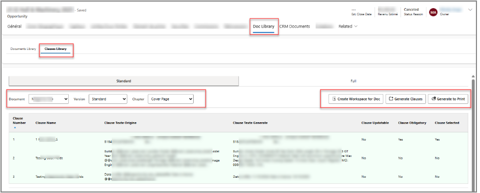 - Create Workspace for Doc – Copies all relevant data from the Document Library Management side and creates clause records for the selected document, version, and chapter. If existing clause records are found, they are deleted and recreated to maintain consistency.