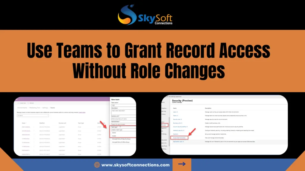 - Azure AD Security Group Team – Functions similarly to an Owner Team, allowing ownership of records and assignment of security roles.