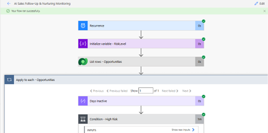 After all email and escalation logic, add a Dataverse Add Row action to log every AI intervention to FollowUpAILog. This creates a permanent audit trail for KPI reporting.